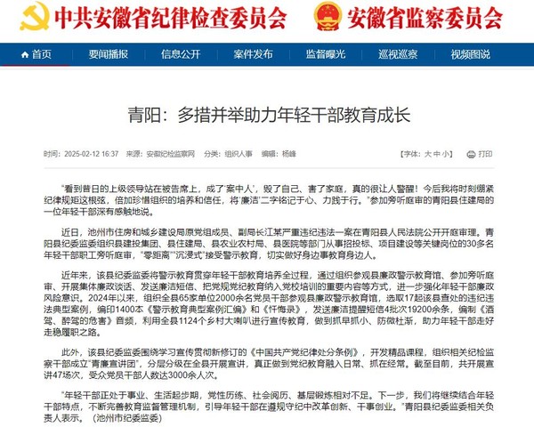 “年轻干部正处于事业、生活起步期,党性历练、社会阅历、基层锻炼相对不足。下一步,我们将继续结合年轻干部特点,不断完善教育监督管理机制,引导年轻干部在遵规守纪中改革创新、干事创业。”青阳县纪委监委相关负责人表示。